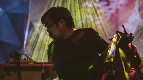 Utilizing the versatility of the cello and his electronics, he has long-standing collaborations with Marcus Fischer (12k), Le Berger, Stephen Vitiello (12k), and Robert Donne (Anjou, Labradford, Kranky), having collaborated on albums, short pieces, and soundtracks.